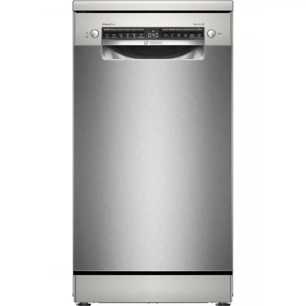 Szabadonálló Mosogatógép - Serie 4 - Home Connect - Nemesacél - 10 teríték - Energiaosztály:B - 6 program - 6 opció - LED kijelző - Nyomógombos vezérlés - Hőcserélő kondenzációs szárítás - VarioFlex kosárrendszer - VarioDrawer - 8,7 liter/ciklus - 44 dB(A) re 1 pW - Programok: Eco 50°C, Auto 45-65°C, Intenzív 70°C, Rövid 60°C, Silence 50°C, Favourite/Előöblítés - Opciók: Időzítés (x), Extra szárítás, EfficientDry/ Open Dry, Intenzív Zóna / Power Zone, Speed Perfect +, Machine Care, További opciók a HC alkalmazásban - Kijelzés: Só és öblítőszer- hiány, Maradék idő - Felszereltség: Aqua Stop, Eco Silence Drive , Aqua Sensor, Töltöttség szenzor, Háromszoros szűrő rendszer, Regeneráló elektronika, Üvegvédelmi rendszer, Dosage Assist, Elektronikus nyomó gombzár - Kosárrendszer: Váltókar technika, Állítható felső kosár (Rackmatic), Lehajtható elemek az alsó kosárban (2db), Lehajtható elemek a felső kosárban (2db), Lehajtható pohártartó az alsó kosárban (1db), Lehajtható pohártartó a felső kosárban (1db), Kosár megállító ütközők, Alacsony súrlódású Kerekek az alsó kosárban, Alacsony súrlódású Kihúzórendszer a felső kosárban - Méretek (mm, ma x szé x mé):845x450x600 - Állítható lábak(mm): max. 20