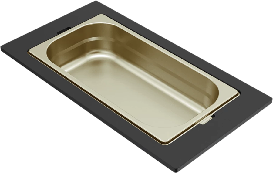 Egyrészes aluminíum tároló edény arany színben, fekete HPL kerettel. Használható DIALOGO 360 WORKSTATION mosogatókhoz.