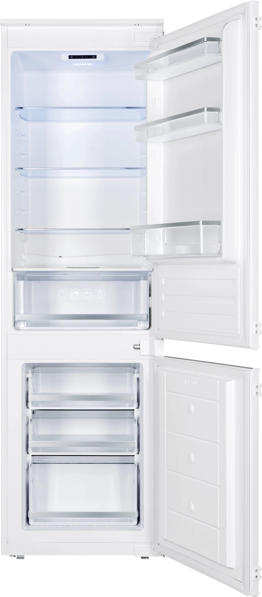 Hűtőszekrény-rész: térfogat 195 l; 1 fix és 3 állítható edzett üvegpolc; 2 fiók zöldség és gyümölcs számára; belső LED világítás; az ajtóban nagy palacktartó rekesz és 2 standard rekesz az élelmiszerek áttekinthető tárolásához; tojástartó.