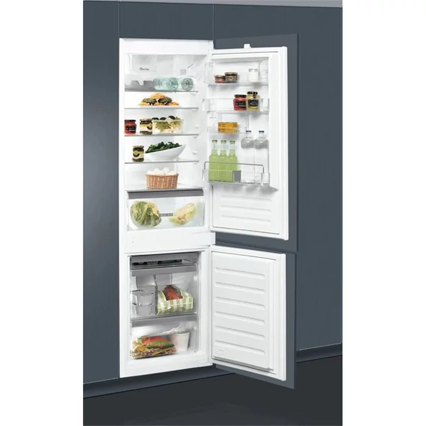 Whirlpool beépíthető hűtő-fagyasztó jellemzők: fehér szín. Üveg polcok profil fronttal, mely robosztusságot, eleganciát, és extra biztonságot nyújtanak, Egy ventilátor, amely egyenletes levegőáramlást biztosít a készülék belsejben, a fokozott szellőzés érdekében. 6. Érzék szenzorok, amelyek automatikusan csökkentik a készülék belsejében lévő hőmérsékletet, amikor új élelmiszert tárol benne, csökkentve az energiafogyasztást. Kényelmes tároló a palackok számára, hogy biztonságosan tárolja azokat.