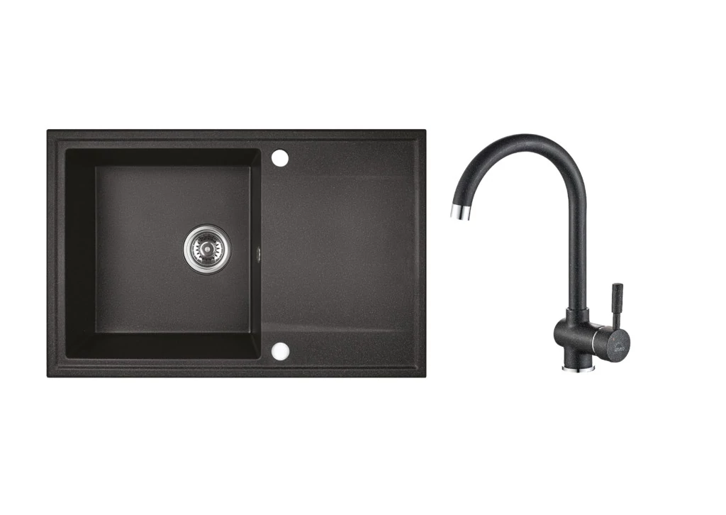 RIO 1CS SZETT egymedence csepptálcás gránit fekete mosogató szifonnal, csappal, 76x44x17,5 cm