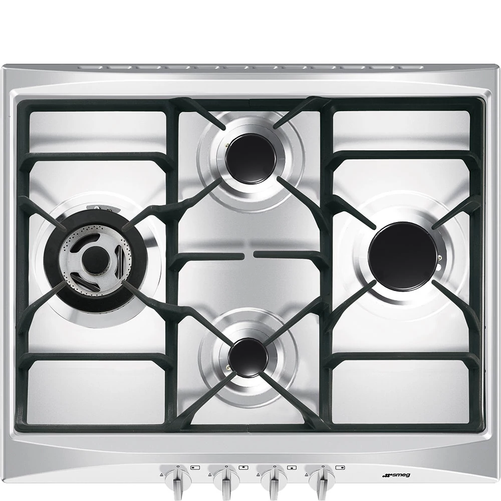 SMEG GÁZ FŐZŐLAP,Selezione,60 cm,4 égő,ebből 1 db 3,9 kW-os wok égő,öntöttvas edénytartó rácsok,szálcsisz.rm.acél